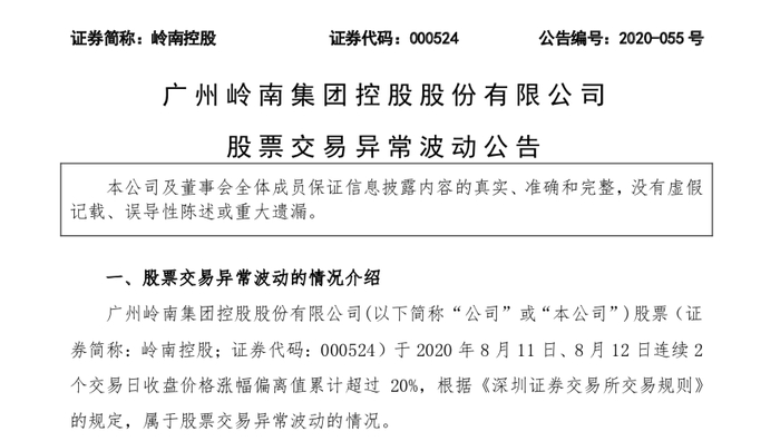 8月12日,岭南控股发布股票交易异常波动公告,针对该情况,岭南控股表示公司控股股东和实际控制人不存在关于公司的应披露而未披露的重大事项。