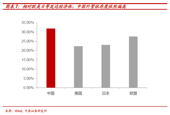首当其冲的是需要改变目前对外贸易依存度仍然较大的经济构成。由于2008年以前,我国一直是出口导向型经济,外贸依存度(即:进出口占GDP比重)一度高达2006年的64.24%。金融危机后,尽管整体对外贸易依存度,特别是对美外贸依存度都出现了明显下降:外贸依存度从64%下降至目前的32%,对美外贸依存度亦下降了50%以上,在国际上已处于合理区间,但相对欧美日等发达经济体(一般在22%左右),外贸在GDP中的比重仍然偏高。相对较高的外贸依存度意味着内循环下,产能与供给的相对过剩将成为内循环下需要解决的第一个问题。