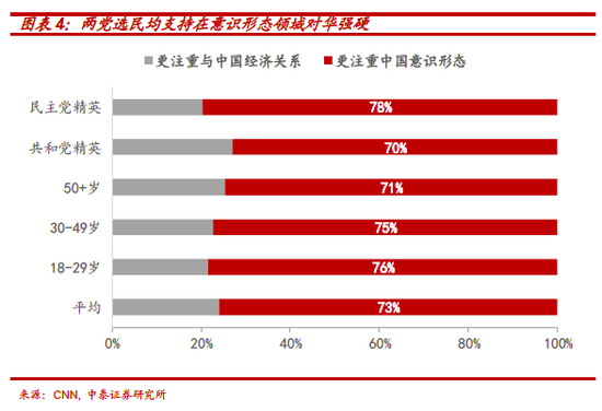 其次,从民意上看,疫情之后,几乎美国各党派、各年龄段对华敌意均显著上升,73%的美国人对中国有负面看法。更为重要的是,绝大多数美国人支持对华强硬,即使会牺牲经济,诸如:73%的美国人认为在对华交往时,应将所谓的人权问题置于经济关系之上,且两党选民在这一议题上高度一致(70%的共和党人,78%的民主党均支持这一做法),这意味着多数对华法案、措施的推进在国会都或很难遇到实质性阻力。
