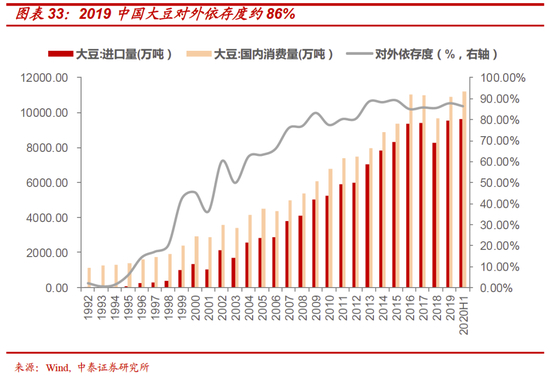 粮食安全“事关十几亿人口吃饭”。从上游原材料进口数据细分看,就粮食而言,近年来粮食进口维持了较高的增速。2019年,我国农产品进口1509.7亿美元,同比增长10%;2020年上半年,我国农产品进口812.6亿美元,增长13.1%。就细分品种看,谷物进口1259.9万吨,同比增33.9%;大豆进口4504.5万吨,同比增17.6%。从粮食对外依存度来看,尽管我国水稻、小麦、玉米三大谷物自给率保持在98%以上,但大豆等对外依存度约86%,主要依赖于巴西、美国的进口。