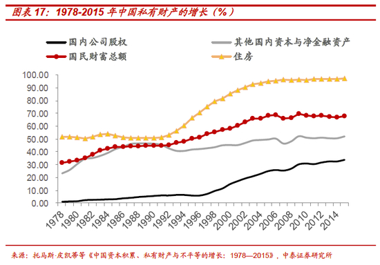 纵观过去四十年的居民财富积累,私人财富的快速累积对应阶段为:1978-1995年的国内资本;1995-2015年的房地产资产及公司股权。这其中房地产又是最重要的私人财富增长驱动力,从托马斯·皮凯蒂在《中国资本积累、私有财产与不平等的增长:1978—2015》中的数据所反映的:顶层10%人口的财富份额依靠房地产市场发展从1995 年的40%上升至2015 年的67%,中间40%人口和底层50%人口的财富份额却出现下降。从这个角度上说,如果政策持续加大对房地产的压力,似乎贫富分化能够得到一定程度的缓解。