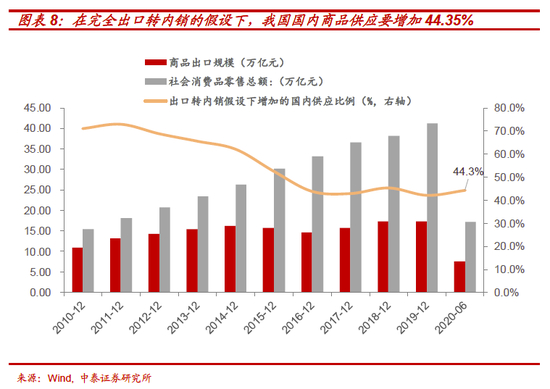 在内循环下的出口转内销的假设下,根据测算,我国消费市场或消化不了将显著增加国内市场的供应量。2020年上半年我国累计出口商品规模为7.64万亿,社会消费品零售规模为17.23万亿,在完全出口转内销的假设下,我国国内商品供应要增加44.35%。但从国内消费市场的消化能力来看,今年上半年国内社会消费品市场同比下滑11.76%,即便按照疫情前的水平,2019年6月我国消费品总额同比增加8.44%的内需增长能力仍不能满足完全消化增加的40%左右的供应比例。