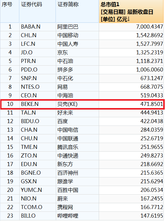 上市短短一周,贝壳找房的市值排名就已经跻身中概股前十。