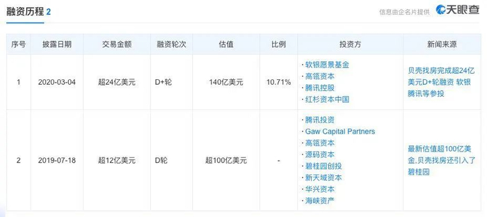 2020年3月,贝壳完成了D+轮融资,投资方包括软银、腾讯、高瓴资本、红杉资本,总融资额超过24亿美元,融资后公司估值已达140亿美元。