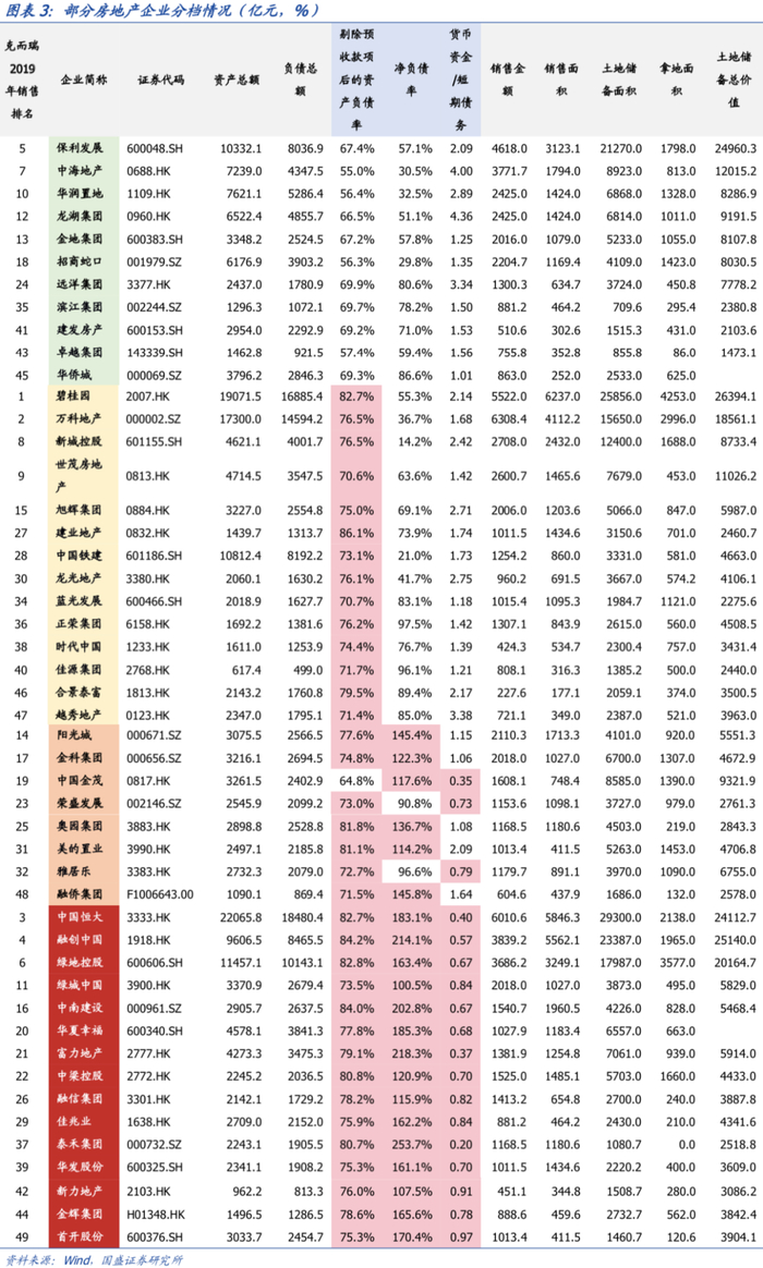 根据国盛证券按“三道红线”标准测算,以2019年末数据为基准,销售排名前50位的房地产企业中,均未超过警戒线的有11家,超过1条警戒线的有15家,超过2条警戒线的有8家,超过3条警戒线的有15家