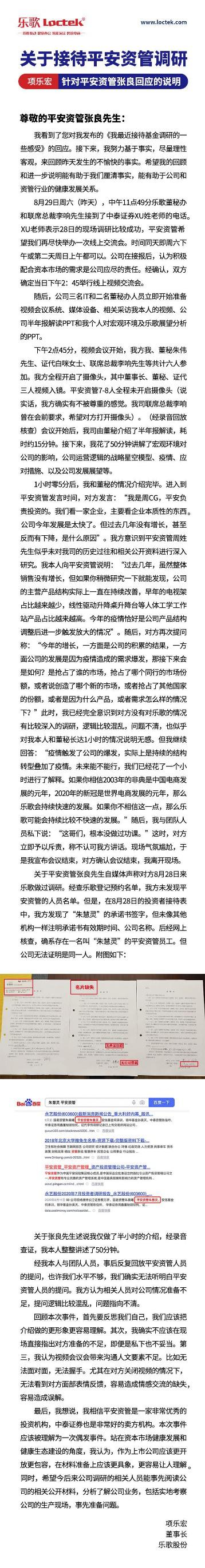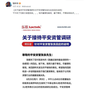 8月30日,此次调研乐歌股份的平安资管投资经理张良亦在朋友圈回应称,8月28日确实去了现场调研,不存在所谓“没有来过乐歌一次调研”。并称,8月29日线上调研时问了两个问题,大概问题特别冒昧,视频中董事长摔门而出,该问的问题下次还会问。