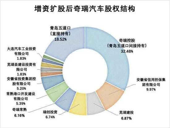 2019年12月4日,青岛五道口合计投资144.49亿元入股奇瑞,分别持有奇瑞控股51%股权、奇瑞汽车18.51%股权,并取代芜湖国资委,成为奇瑞实际控股人。