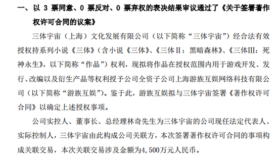 除了减持,卖版权也毫不手软。2020年6月18日著作权转移公告显示,游族网络就以4500万元的交易对价,在林奇关联方取得了《三体》的游戏改编权。要注意,这个金额已超过上市公司最近一期经审计净资产的0.5%。