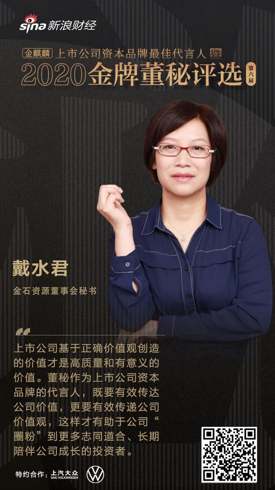 新浪财经主办的2020(第六届)金牌董秘网络票选于8月13日正式启动。本次金牌董秘网络票选时间为8月13日-9月8日。评选期间,新浪财经推出“对话董秘”专访活动,近距离接触董秘圈,深度展现一幕幕与董秘相关的故事。本期,新浪财经带您走近金石资源董秘戴水君女士 。(给她投票)