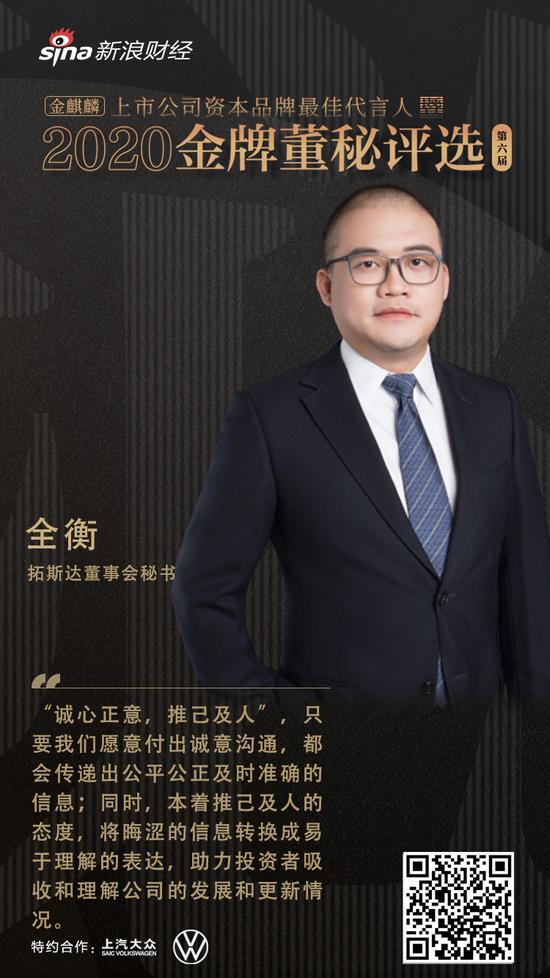 新浪财经主办的2020(第六届)金牌董秘网络票选于8月13日正式启动。本次金牌董秘网络票选时间为8月13日-9月8日。评选期间,新浪财经推出“对话董秘”专访活动,近距离接触董秘圈,深度展现一幕幕与董秘相关的故事。本期,新浪财经带您走近拓斯达董秘全衡先生。(给他投票)
