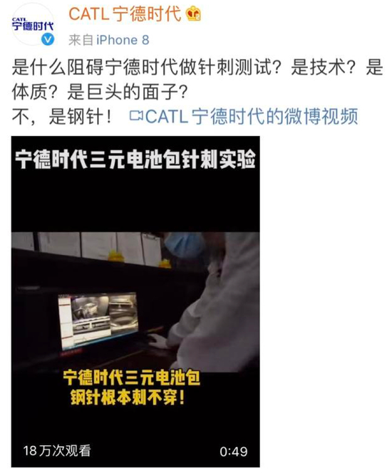 此后又有网友购买了宁德时代5系及8系三元锂电池进行了针刺测试,结果两次测试均发生了爆燃。有趣的是,宁德时代为了回应市场的质疑,也公布了一场针刺试验,结论是针扎不进宁德时代的电池......