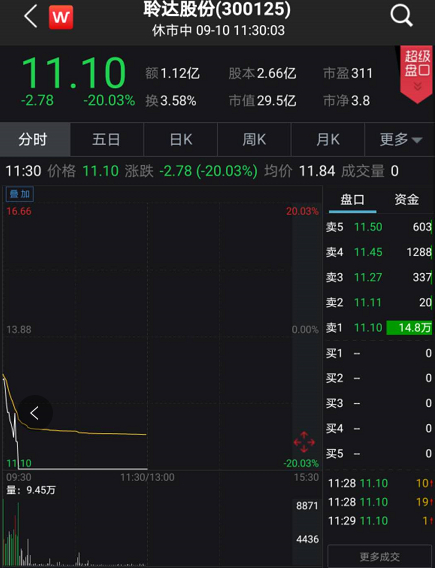 截至午盘,聆达股份依旧报收跌停,超14万手卖单封死在跌停板上。