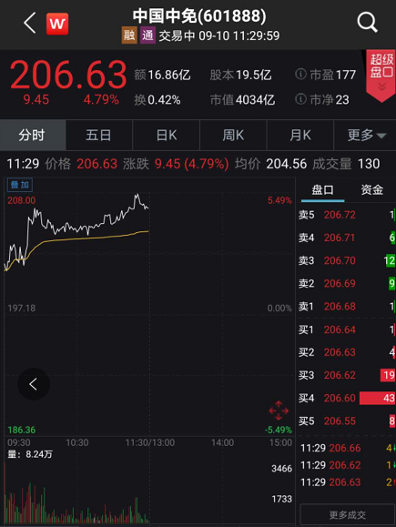 9月10日上午,免税板块异动明显,其中中国中免盘中大涨超4%以上,王府井涨停,免税店指数一度涨超2%以上。