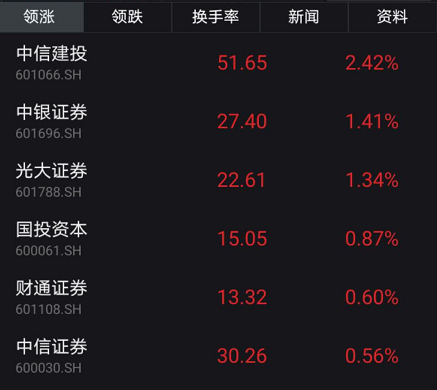 除此之外,被称为“牛市旗手”的券商板块早盘也出现了明显异动,临近午盘,板块直线拉涨力撑指数。中信建投一度涨超3%,光大证券、中信证券、中泰证券普涨。