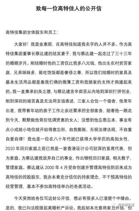今天突然给各位写这封公开信,想必有很多人已清楚个中缘由。是的,我已向法院提起离婚析产诉讼。我起初本无意将家丑外扬,但如果继续保持静默,担心以讹传讹,混淆视听,加上近日蔡达建居然以高特佳公司的名义用公款高价聘请深圳某知名律所的律师作为其私人的代理人欲与我对簿离婚公堂,顿时让我打消了原来不想将事情公之于众的念头。