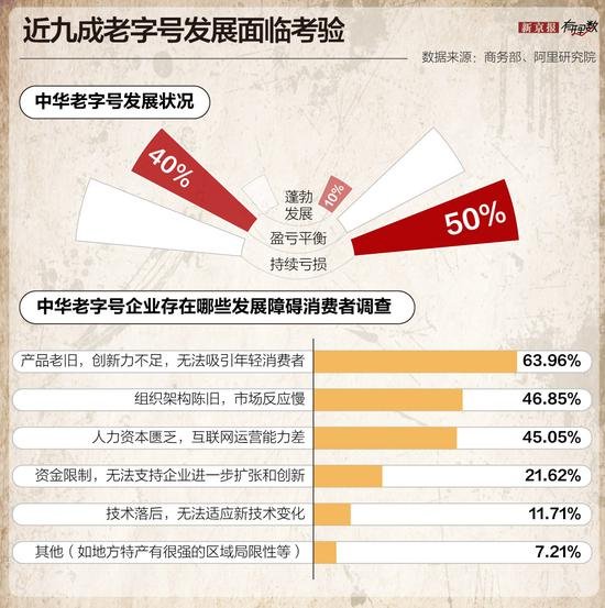 近代以来,在现代工业发展、商业模式等因素的冲击下,不少老字号企业面临着严峻挑战,业务第一曲线下滑。据商务部统计,在现存的1128家中华老字号中,仅10%的企业蓬勃发展,40%的老字号勉强实现盈亏平衡,而近一半都是持续亏损状态。