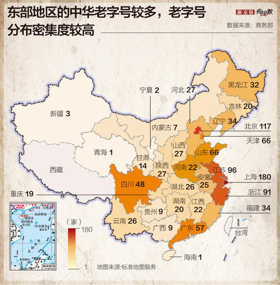 总体看来,中华老字号品牌在我国各地区的分布并不均衡,出现较大差别,分别散落在数十个省市及自治区。但大多数都聚集在沿海及内陆经济发达地区。譬如,上海有180家,北京117家;而西部地区宁夏仅两个、青海一个,西藏没有。