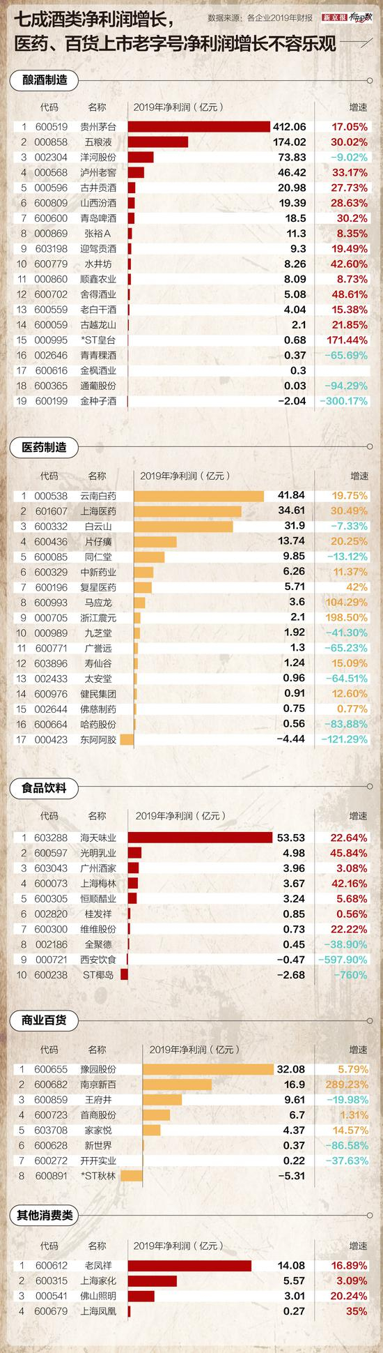 有理数整理了58家上市的中华老字号品牌及营业额,根据各家2019年财报,近七成酒类老字号保持了净利润同比增长,其中贵州茅台的净利润最高,为412.06亿元。而医药制造和商品百货老字号近一般净利润都出现了同比下降。这其中东阿阿胶、ST秋林的利润下滑较为严重。
