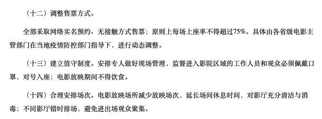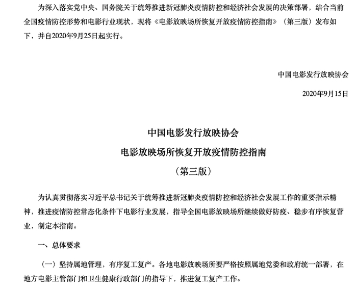 9月15日,中国电影发行放映协会发布了《电影放映场所恢复开放疫情防控指南》(第三版),自2020年9月25日起,上座率限制条件进一步放宽。