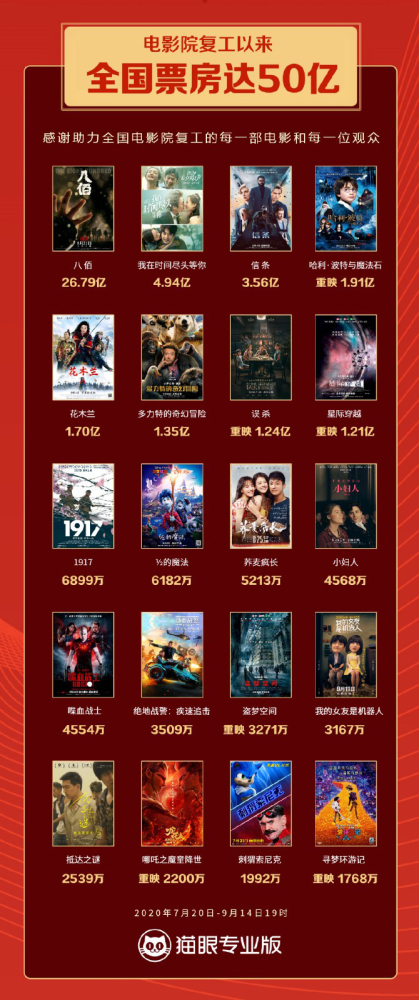 据猫眼专业版数据显示,自7月20日影院复工以来,截止9月14日,复工后票房突破50亿元,全国观影人次1.4亿,放映场次1122万。《八佰》、《我在时间尽头等你》、《信条》《哈利·波特与魔法石》和《花木兰》五部影片位列票房榜前5。