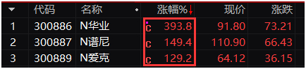 就在9月16日,创业板注册制下第4批新股上市,包括华业香料(300886.SZ)、谱尼测试(300887.SZ)和爱克股份(300889.SZ),3只新股股价全部实现翻倍,首日分别较发行价上涨393.8%、149.4%和129.2%。