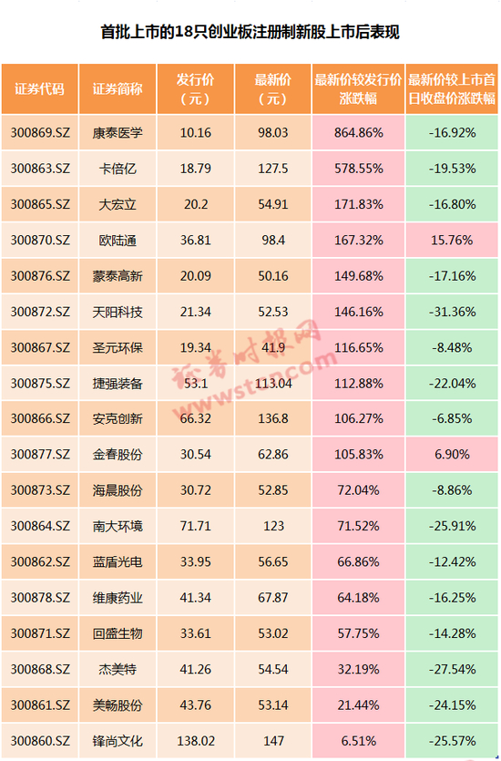 挂牌近20个交易日 创业板注册制“18罗汉”平均较发行价涨161.81%