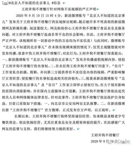 随后,狗不理王府井店在微博发布“针对网络不实视频的严正声明”称,该视频的所有恶语中伤言论均为不实信息,要求“谷岳”等立即停止侵权行为,“并在大于现有影响的范围内消除影响并在国内主流媒体公开道歉”、“目前已向北京网安支队报警。”