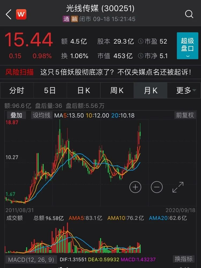 截至9月18日收盘,华谊报收5.52元,总市值153.90亿;光线报收15.44元,总市值452.95亿。老同行拉开距离,虽然曾经华谊市值超过800亿。