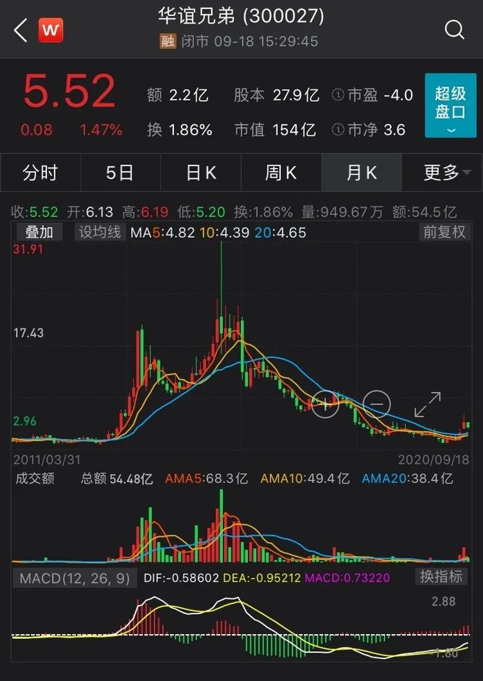 8月14日《八佰》点映,为华谊近期股价第一个高点6.37元,此后重回下滑区间,在8月21日,《八佰》上映日,直线拉升至近期最高点,6.80元,此后在波动中股价继续走向下滑空间。今年4月初,华谊股价仅为3.25元。