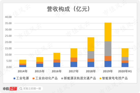 麦格米特发展迅速,营收从2014年的6.35亿逐年上升至2019年的35.6亿,复合增速达41.17%。