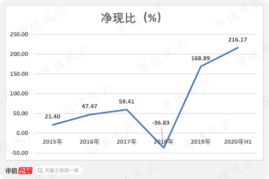因此,净现比也相当不好看,2015年至2018年在100%以下,2019年及2020年上半年才出现大幅反弹。