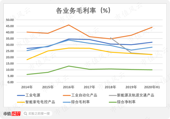 而工业电源和工业自动化业务的毛利率相对较高,但均呈下滑趋势,其中工业电源从同期的34.69%下滑至30.18%,工业自动化从45.94%下滑至2018年的34.76%,在2019年反弹至37.64%。