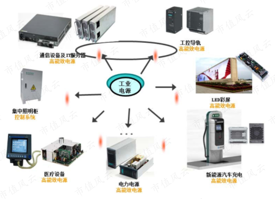 工业电源的主要细分产品为医疗设备电源、通信及电力设备电源、工业导轨电源、商业显示电源。