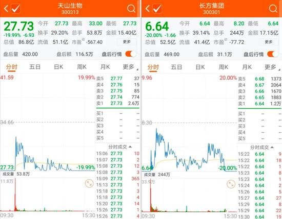 需要关注的是,与豫金刚石一样,天山生物、长方集团两只创业板股票同样是在停牌半个月后复牌,但今日表现明显疲弱许多。两只股票均跌停价位开盘,盘中跌停板一度被打开,但最终回封跌停。
