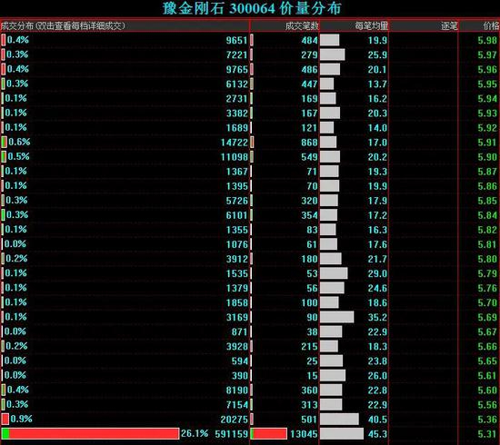 分价数据显示,豫金刚石今日跌停价位成交59.12万手,占全天成交总量的26%。以5.31元/股的跌停价计算,豫金刚石今日跌停板成交金额3.14亿元。