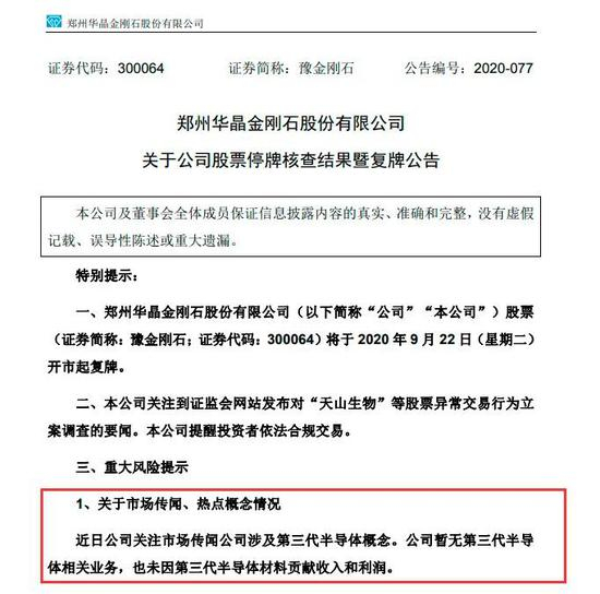 昨日(9月21日)晚间,豫金刚石披露《关于公司股票停牌核查结果暨复牌公告》,公司股票于今日(9月22日)开市起复牌。