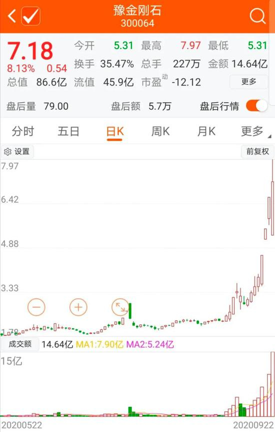 截至收盘,豫金刚石股价报7.18元/股,上涨8.13%,成交14.64亿元,刷新个股历史天量,换手率35.47%。
