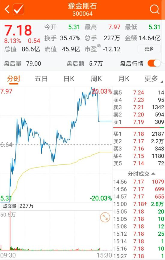 14时40分,豫金刚石股价进一步摸高,并触及7.97元/股的涨停价,完成日内“天地板”。但值得一提的是,在豫金刚石股价触及涨停的过程中,并未出现大资金主动封死涨停。