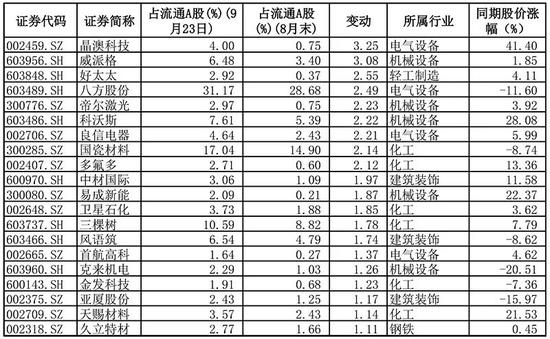 光伏板块晶澳科技本月北向资金持股比例提升3.25个百分点,同期股价大涨41.40%;威派格、好太太、良信电器、国瓷材料等,本月以来北向资金持股比例均提升2个百分点以上。