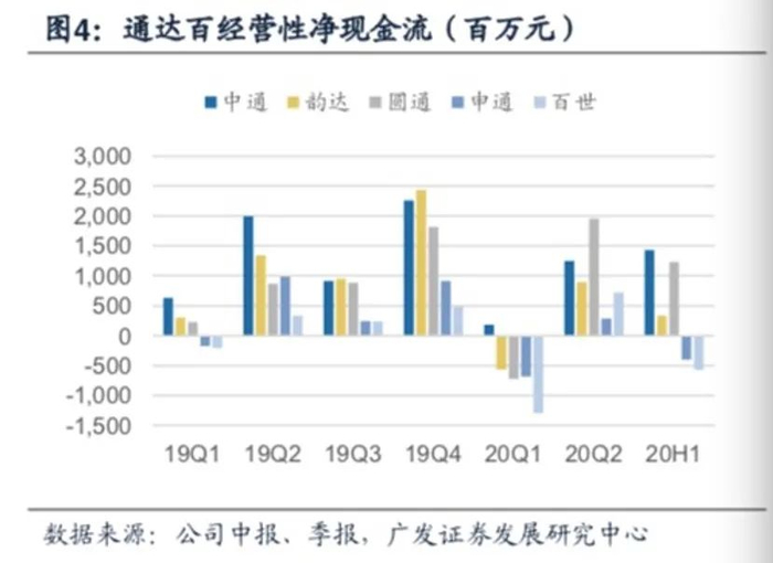 在广发证券看来,在不考虑外部融资的情况下,经营性净现金流决定了快递公司继续扩张的潜力和参与价格战的韧性。从上半年的数据来看,截至2020年6月30日,中通的类现金余额是圆通、申通、百世总和的85%。