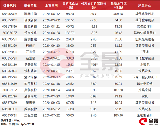 其中,回撤幅度达到50.40%的凯赛生物,其最新收盘价已较发行价下跌26.41%。该股于8月12日上市,最新收盘价为98.20元/股。此外,瑞联新材、时空科技、锋尚文化3只今年8月以来上市的新股也已经破发。