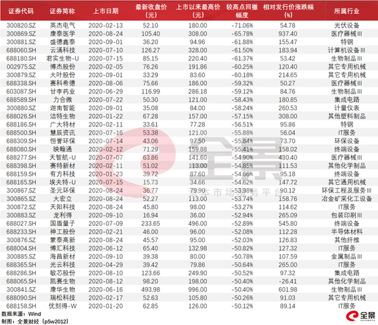 据全景财经(p5w2012)统计,有35只今年以来上市的新股及次新股较历史高点回撤超过50%。在这些个股中,盛德鑫泰、大叶股份、迦南智能、龙利得、海昌新材均为今年9月以来才上市的新股。