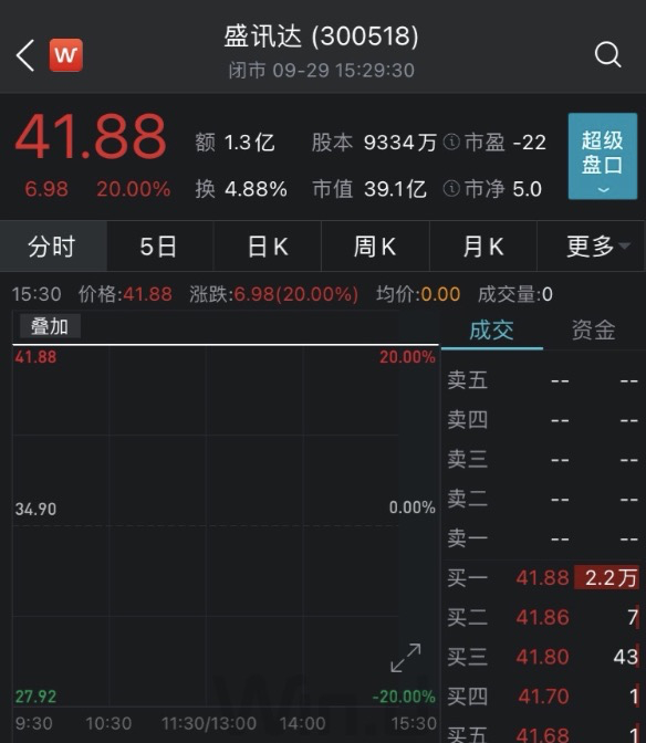 9月29日,游戏公司盛迅达(300518.SZ)一字涨停(注:创业板涨幅20%),最新股价为41.88元/股,成交1.27亿元,市值为39.1亿元。