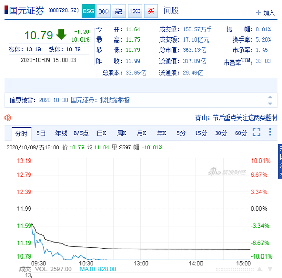 今日A股的暴涨,可国元证券的9.66万股民却开心不起来。国元证券开盘后持续下挫,目前封死跌停,报10.79元/股,跌停板封单超15万手,成交额超17.18亿元。