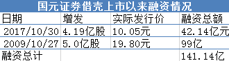国元证券借壳上市以来融资情况