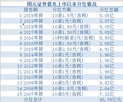 国元证券借壳上市以来分红情况