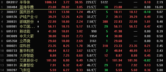 财联社10月12日讯,今日早盘半导体板块集体走强,截至上午收盘,半导体板块涨逾3.7%,蓝海华腾以20%涨幅封板,国民技术、沪硅产业、派瑞股份等纷纷涨逾10%。此外,中芯国际A+H股也均涨逾10%。