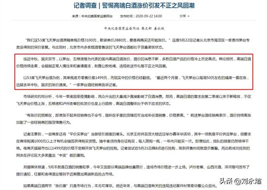 该文章称,临近中秋、国庆双节,以贵州茅台、五粮液等为代表的国内高端白酒涨价、提价的消息不断,多款白酒产品的价格冲上历史高点。以53度飞天茅台酒为例,其单瓶官方零售价是1499元,而现实中的价格已经翻倍。“舆论担忧,高端白酒价格持续走高,会超越正常人情往来和宴请需求,助推公款吃喝、违规收送节礼等不正之风回潮”。