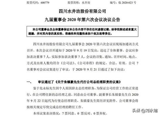 据水井坊9月21日发布的公告称,为保证公司经营工作的正常进行,在公司聘任新的总经理之前,同意由公司董事、副董事长朱镇豪自2020年9月22日起代为行使总经理职责;公司董事会将按相关规定尽快完成总经理的聘任工作。同日,董事会决定将法定代表人由危永标变更为朱镇豪。不过,“临危受命”的朱镇豪不过是“暂代”危永标,具体掌舵水井坊的人选依然未尘埃落定。