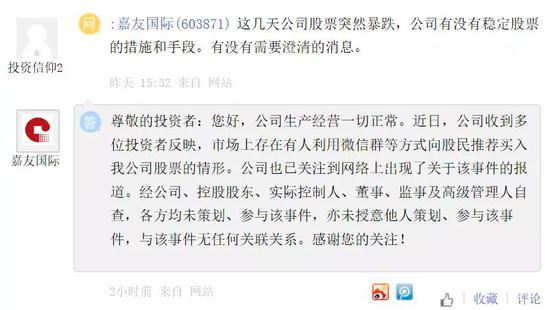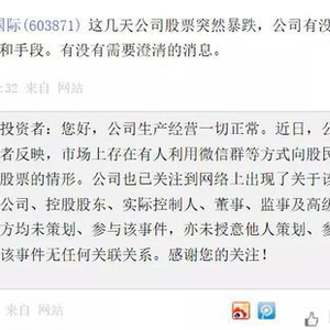 其在回复投资者提问时表示,近日,公司收到多位投资者反映,市场上存在有人利用微信群等方式向股民推荐买入公司股票的情形。经公司、控股股东、实控人、董事、监事及高级管理人自查,各方均未策划、参与该事件,亦未授意他人策划、参与该事件,与该事件无任何关联关系。